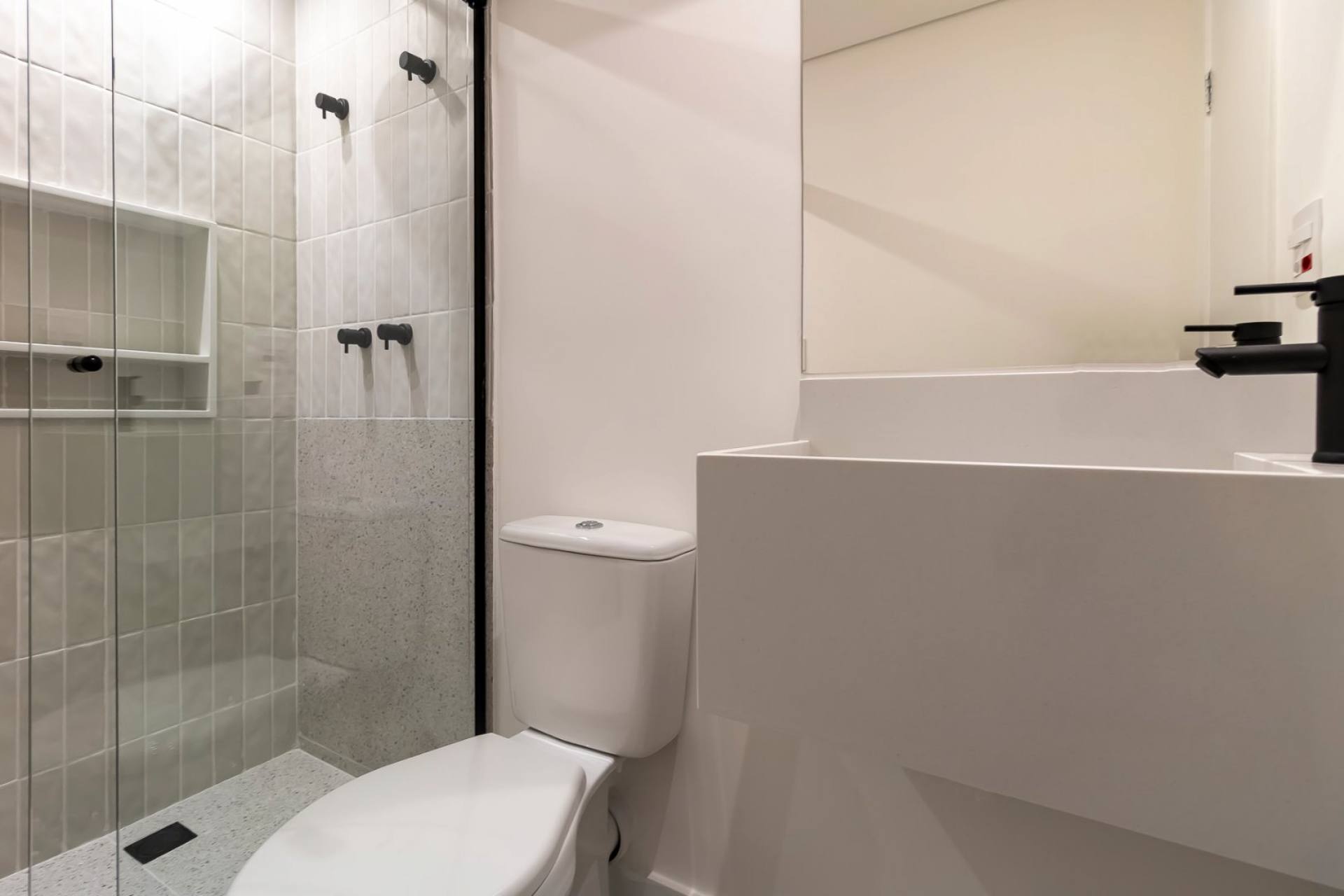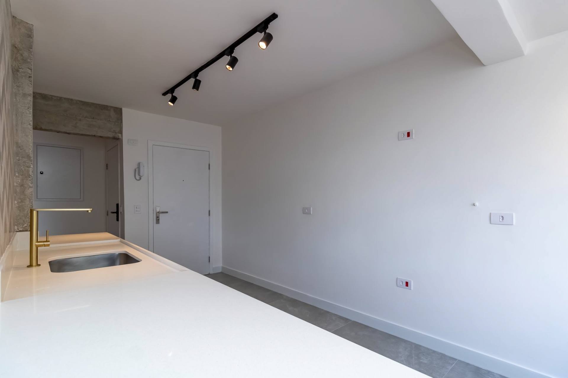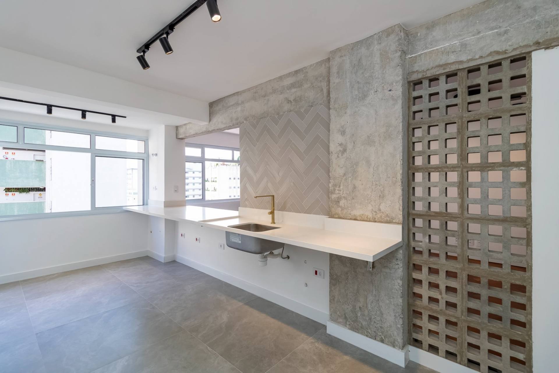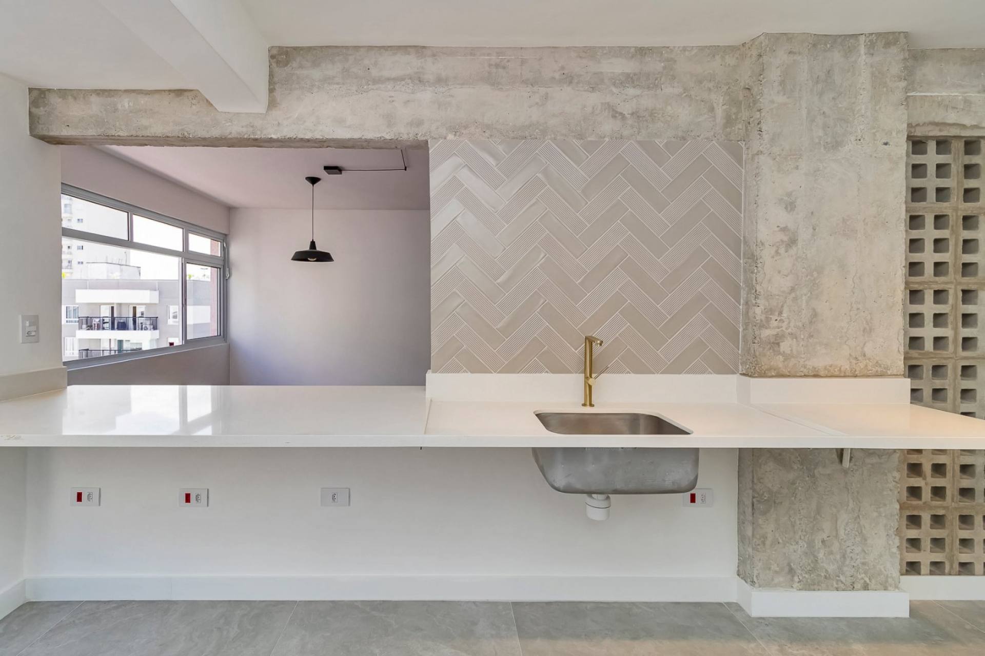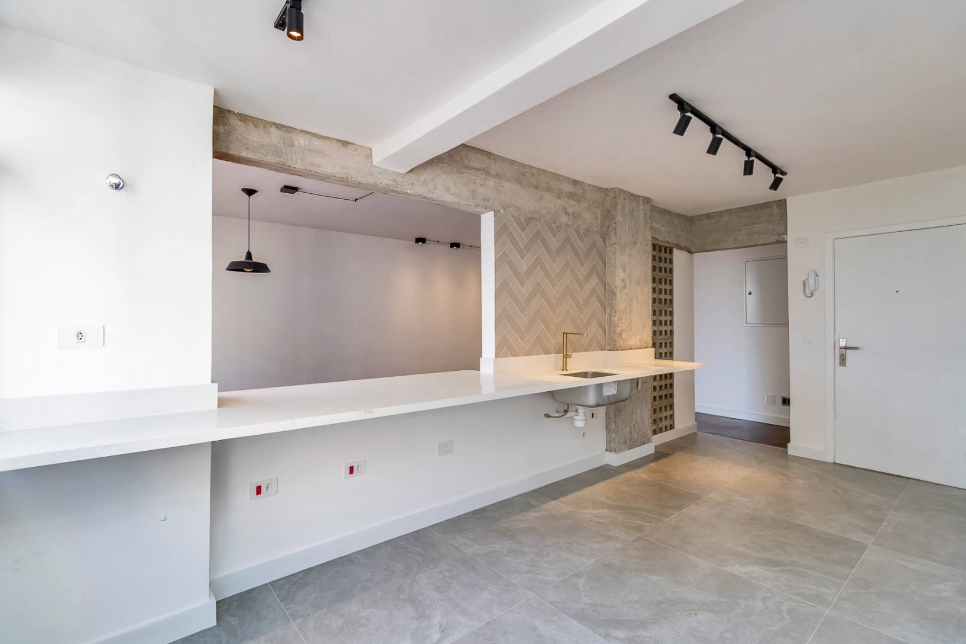 cozinha integrada, área de serviço, banheiro de serviço e vaga de garagem